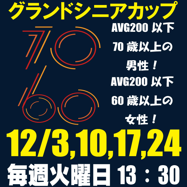 12/17(火)13:30 グランドシニアカップ~AVG200以下の70歳以上の... 3ゲーム 会員 1700円(会員限定イベント) 健康寿命を延ばす最適の生涯スポーツと注目を集めているボウリング! アベレージ200...